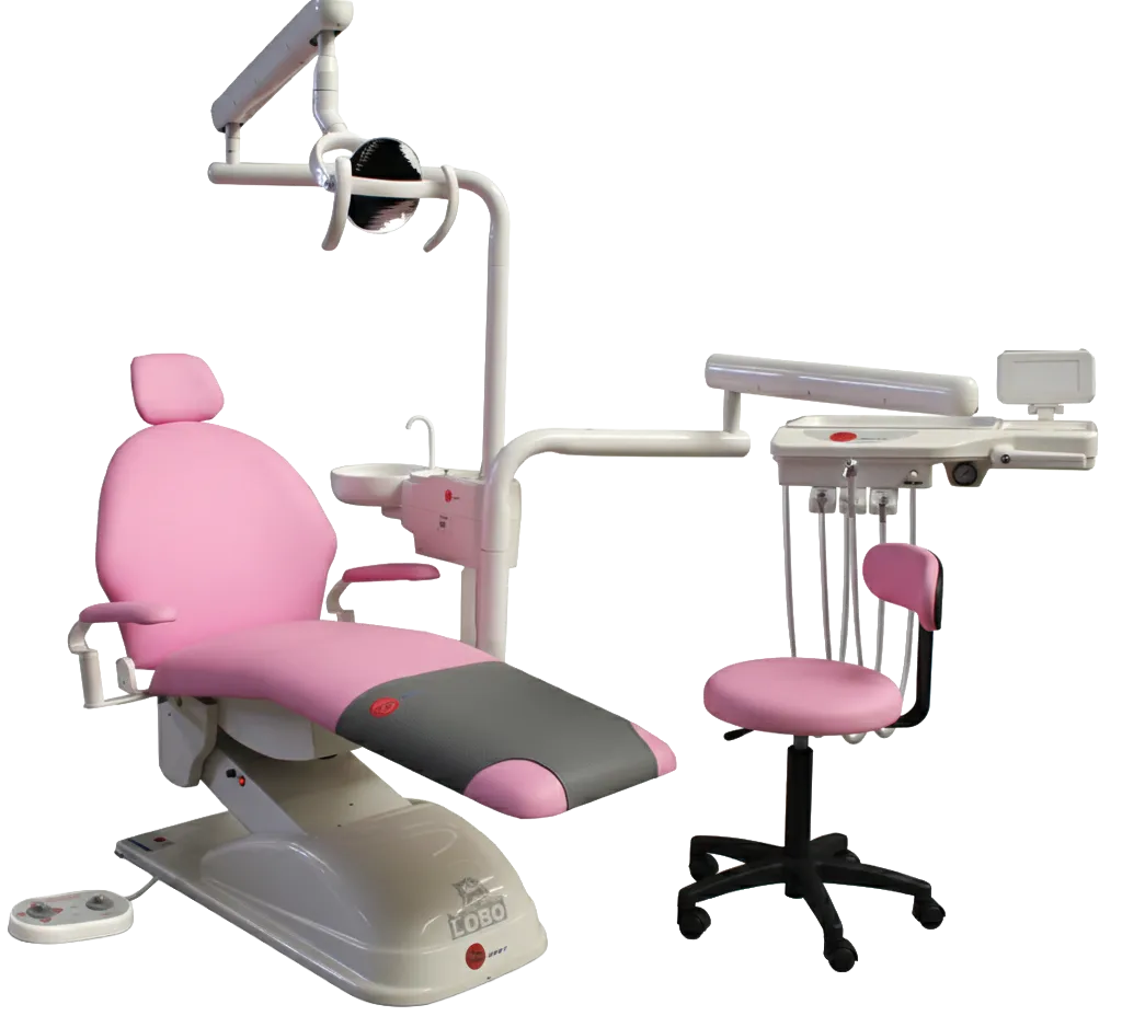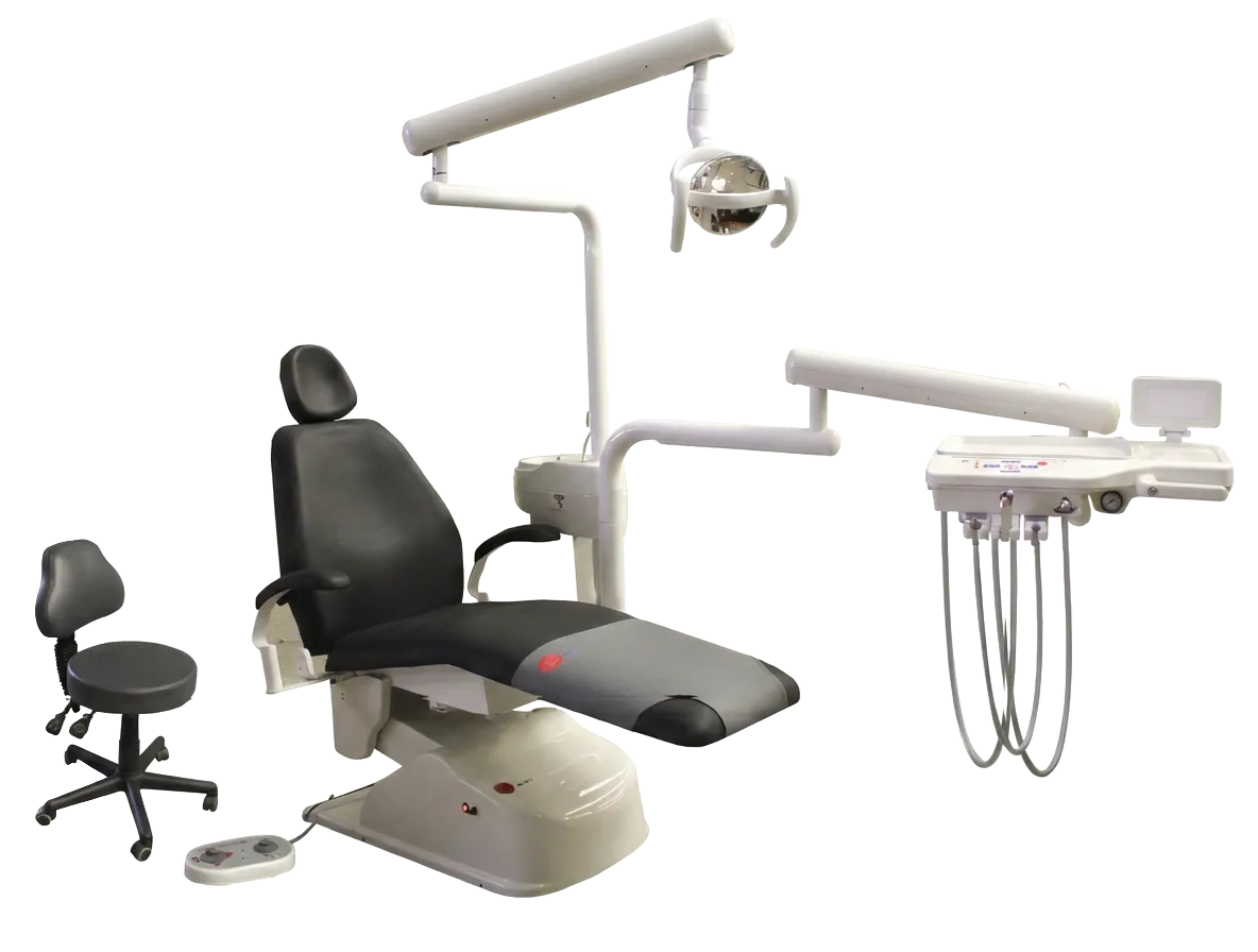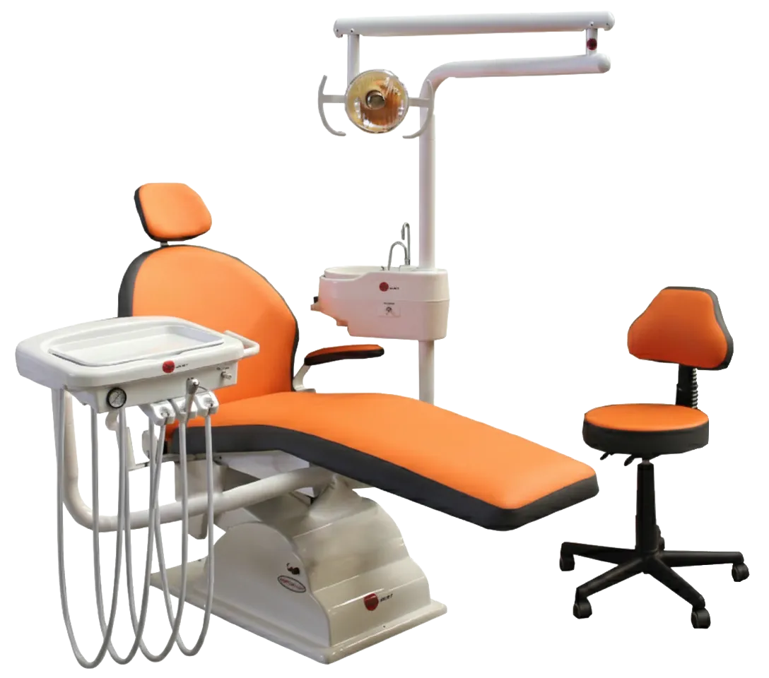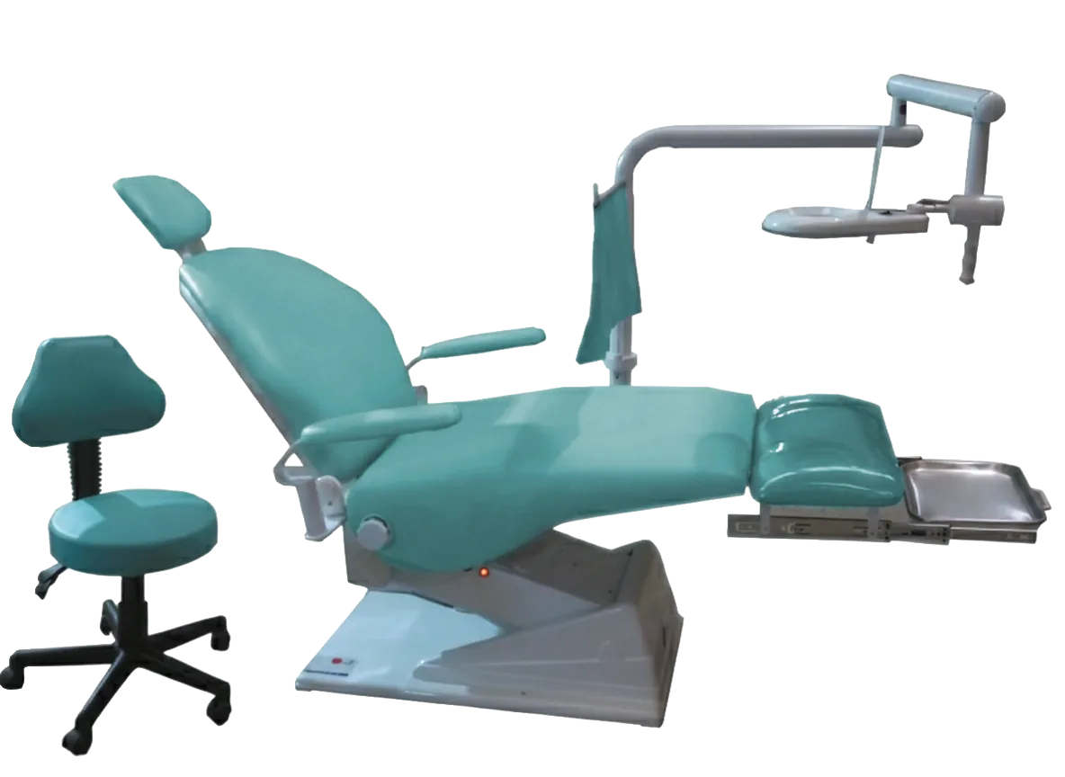 Su sillón eléctrico con tren de lemburg y movimientos programables se combina con un sistema trimodular de alta precisión, salidas neumáticas y escupidera con agua estéril.