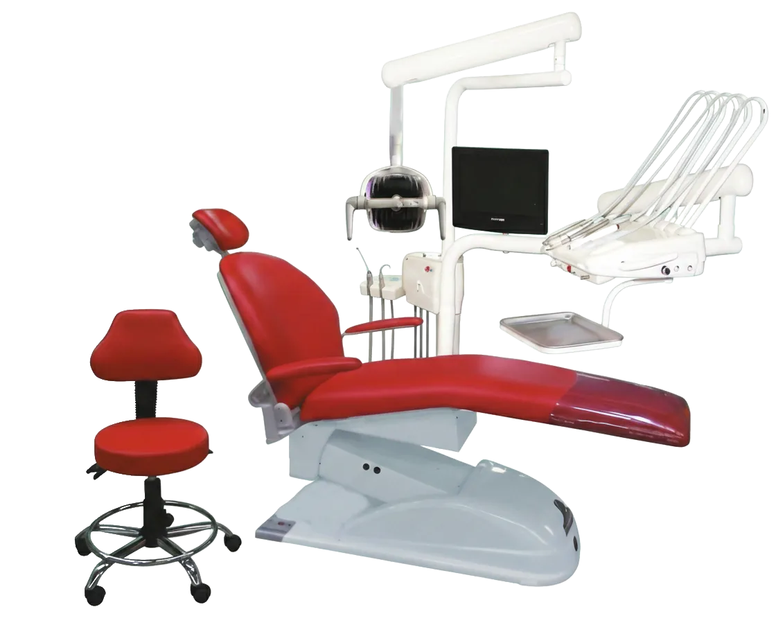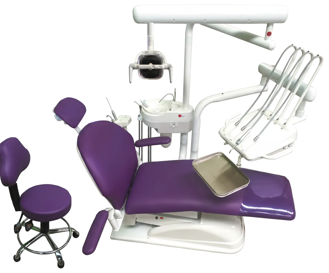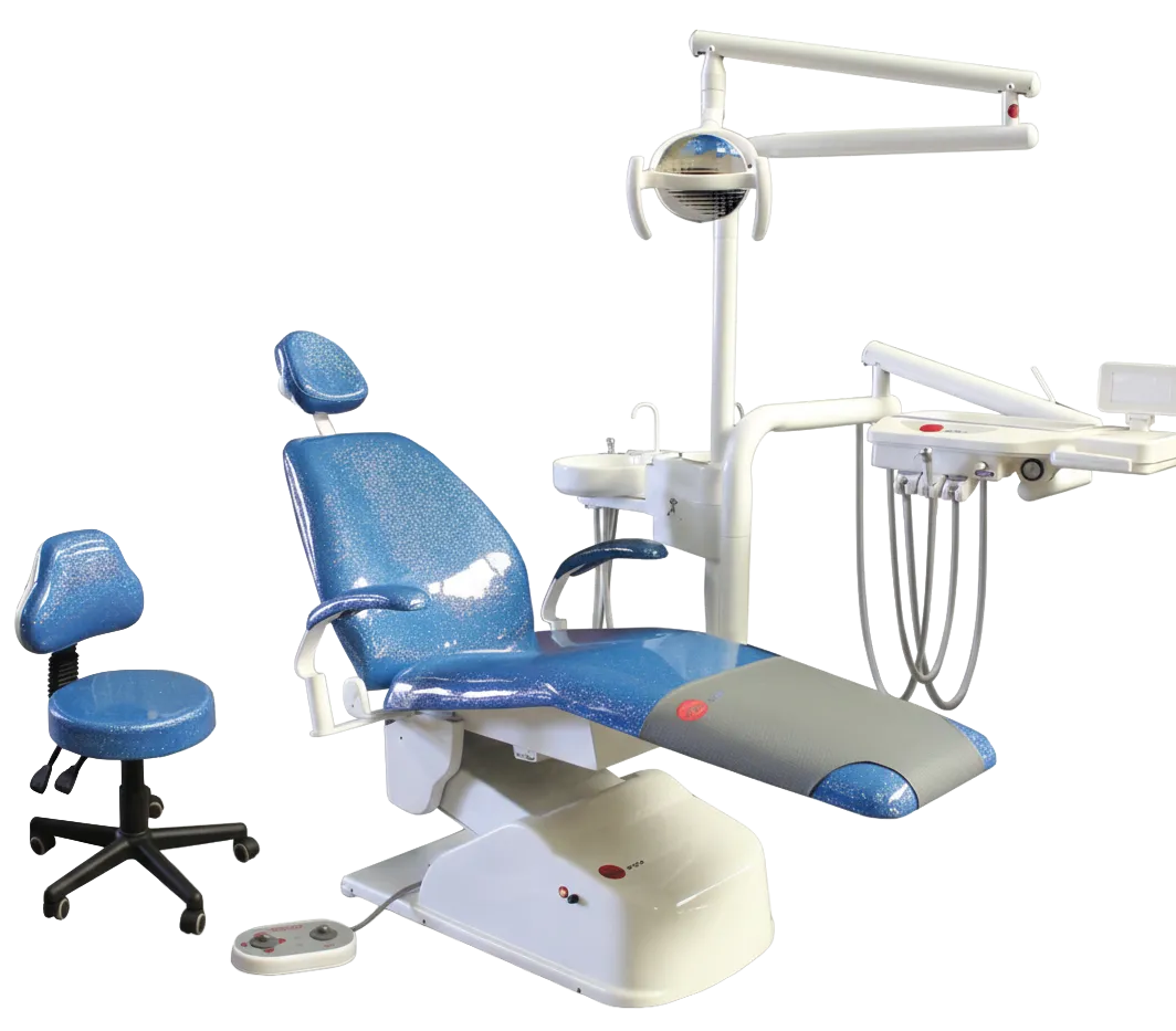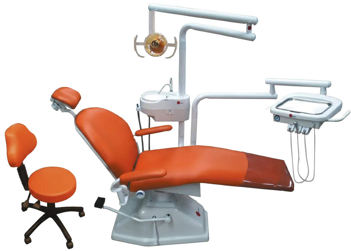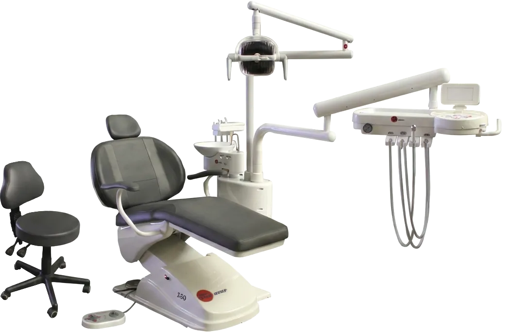 Su sillón eléctrico con tren de lemburg y movimientos programables se combina con un sistema trimodular de alta precisión, salidas neumáticas y escupidera con agua estéril.